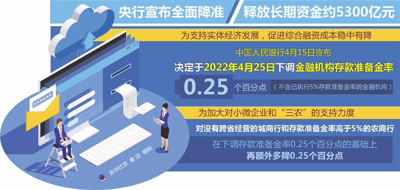 为支持实体经济发展,促进综合融资成本稳中有降,中国人民银行4月15日宣布,决定于2022年4月25日下调金融机构存款准备金率0.25个百分点(不含已执行5%存款准备金率的金融机构)。在此基础上,对没有跨省经营的城商行和存款准备金率高于5%的农商行,再额外多降0.25个百分点。