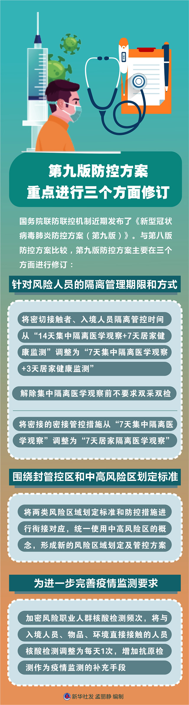 为进一步提高疫情防控的科学性、精准性,国务院联防联控机制近期发布了《新型冠状病毒肺炎防控方案(第九版)》。国家卫生健康委疾控局相关负责人提醒,第九版防控方案决不是放松防控,而是要求更规范、更准确,把该管住的重点风险管住、该落实的措施落实到位。与第八版防控方案比较,第九版防控方案主要在三个方面进行修订。