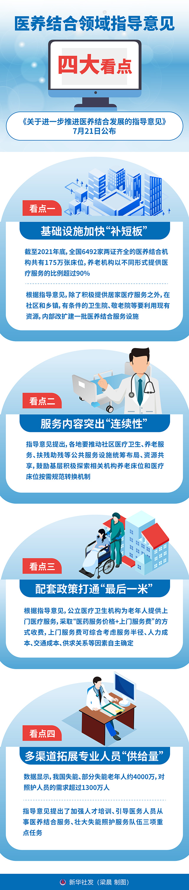 《关于进一步推进医养结合发展的指导意见》7月21日公布,在总结近年试点经验的基础上,进一步完善了我国医养结合的政策、服务、标准、人才、信息等体系,为各地加大服务供给、打通堵点绘出“路线图”。