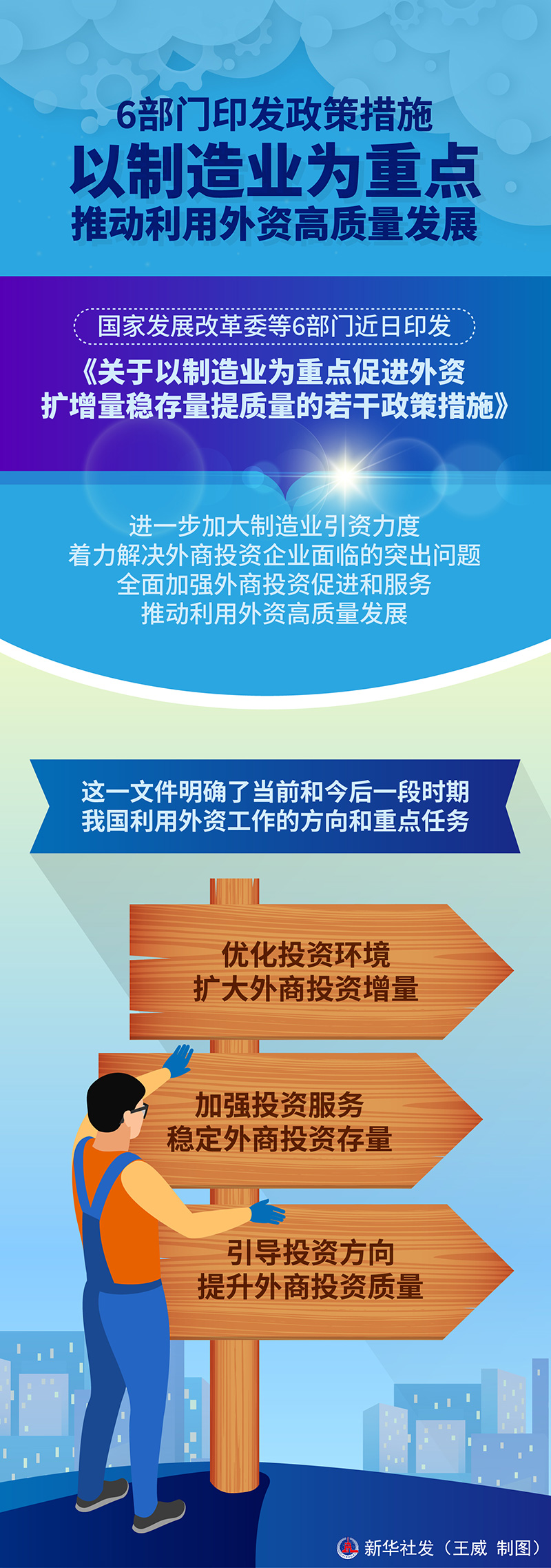 记者10月25日了解到,国家发展改革委等6部门近日印发《关于以制造业为重点促进外资扩增量稳存量提质量的若干政策措施》,进一步加大制造业引资力度,着力解决外商投资企业面临的突出问题,全面加强外商投资促进和服务,推动利用外资高质量发展。