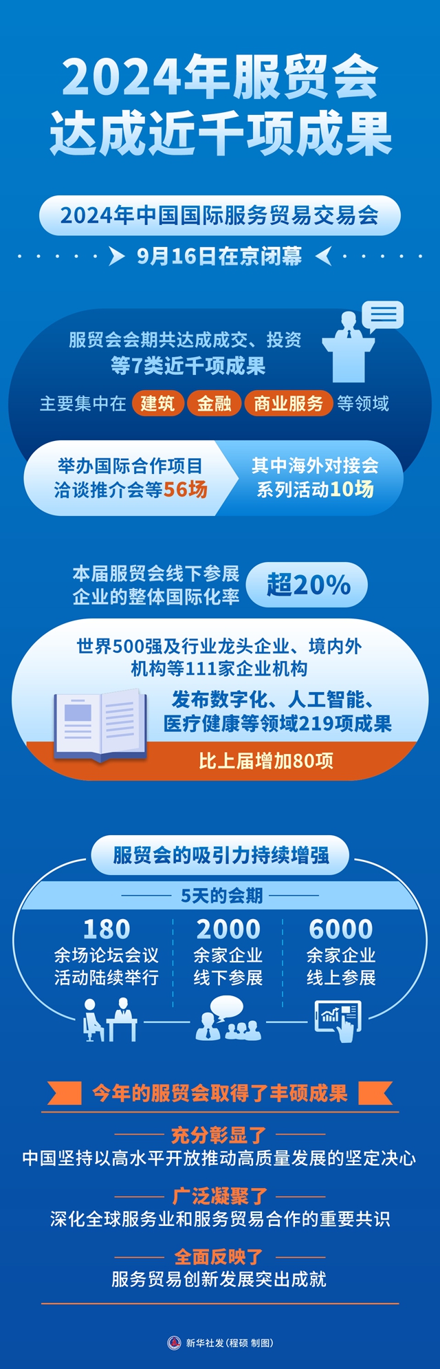 全球服务、互惠共享。2024年中国国际服务贸易交易会9月16日在京闭幕,本届服贸会共达成近千项成果,线下参展企业国际化率超过20%。