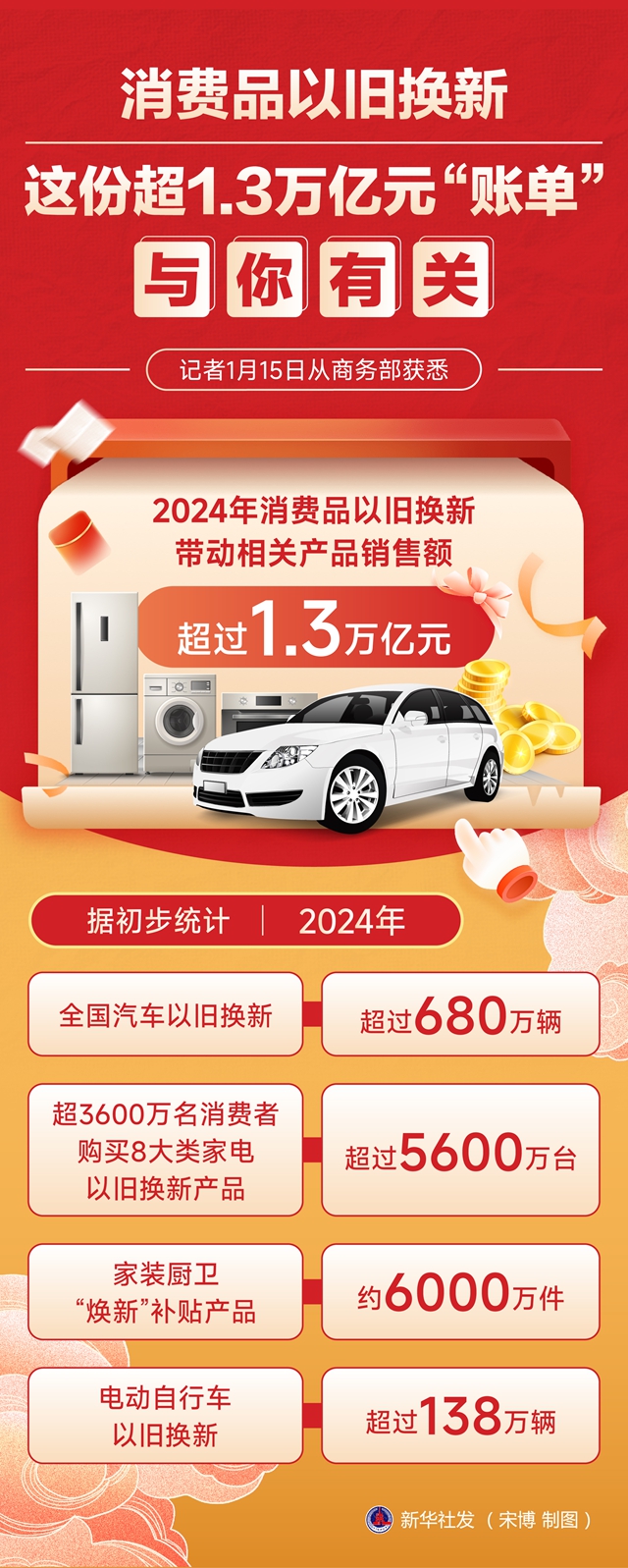 记者1月15日从商务部获悉,2024年消费品以旧换新带动相关产品销售额超过1.3万亿元。