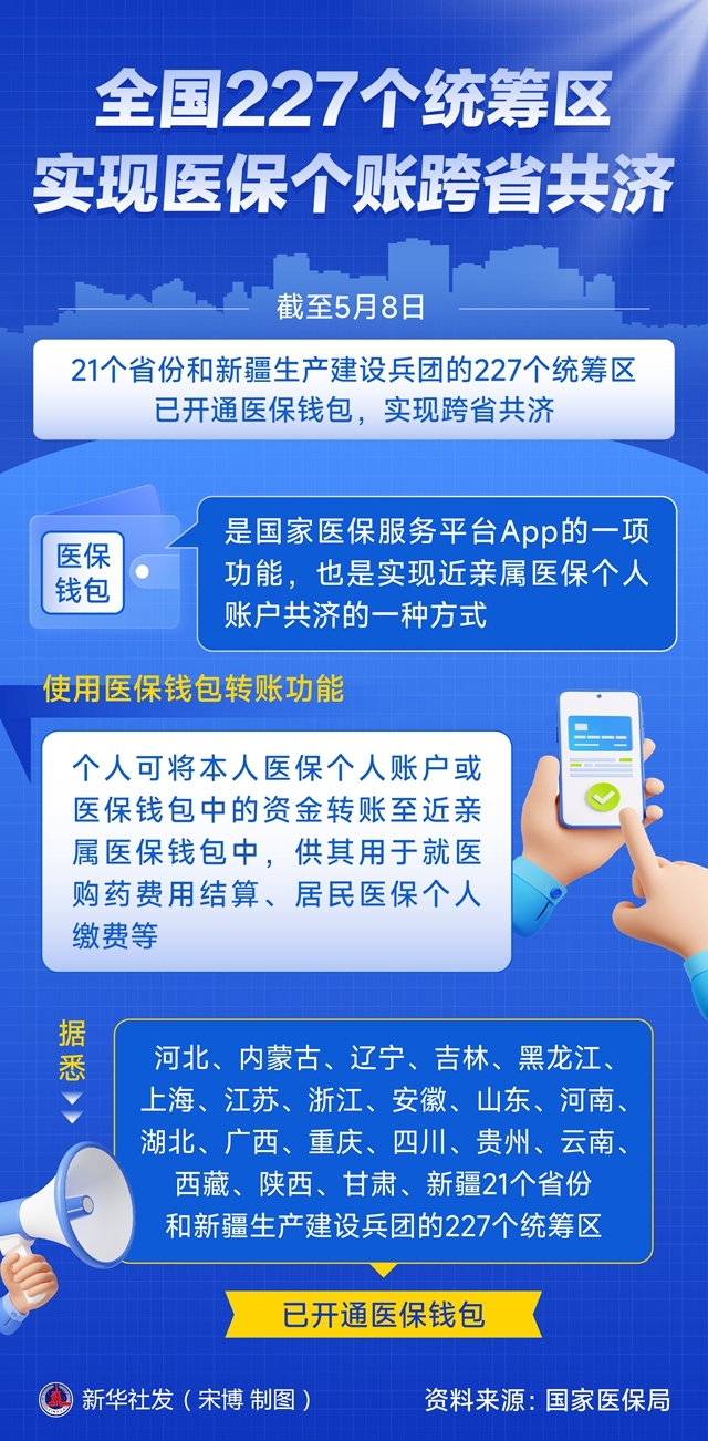 记者5月22日从国家医保局获悉,截至5月8日,21个省份和新疆生产建设兵团的227个统筹区已开通医保钱包,实现跨省共济。