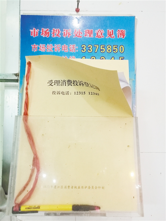 在农贸市场方面,记者在北街市场、嘉福市场、外海中心市场都能见到,墙上有张贴有市场、管理部门的投诉电话,在市场办公室门口还挂有由市场监督管理部门统一制作的《投诉意见簿》,上面也印有客服投诉电话和政府投诉电话:12315和12345。市民对市场服务有意见,都能很方便进行投诉。