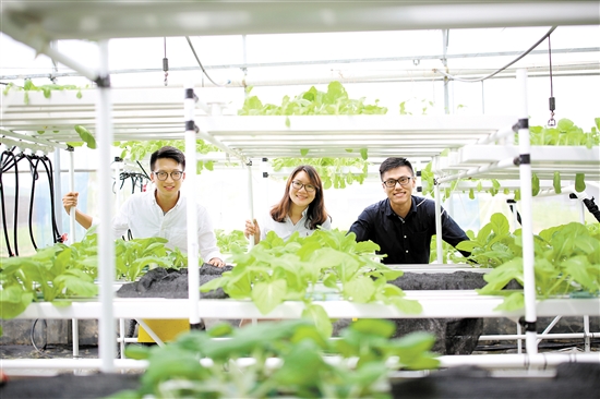 香港青年罗伟特(右)与伙伴梁立锋(左)、谭慧敏组建团队,通过技术攻坚填补了华南地区“鱼菜共生”基础应用数据的空白。资料图片