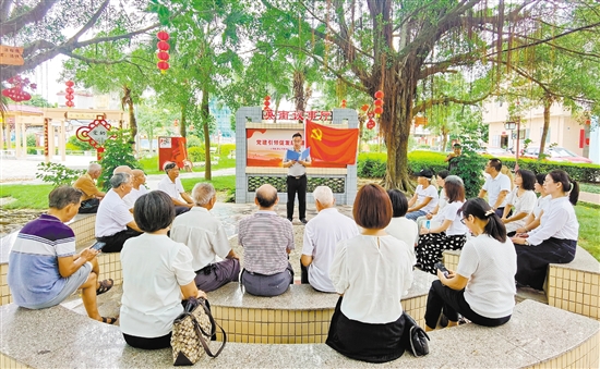 江海区礼乐街道英南村在榕树下的村民议事会中开展政策宣传。资料图片