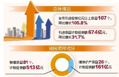 一季度,全市引进投资亿元以上项目107个,完成年度任务的33.4%;引进项目计划投资额674亿元,完成年度任务的33.5%,增长31.7%。