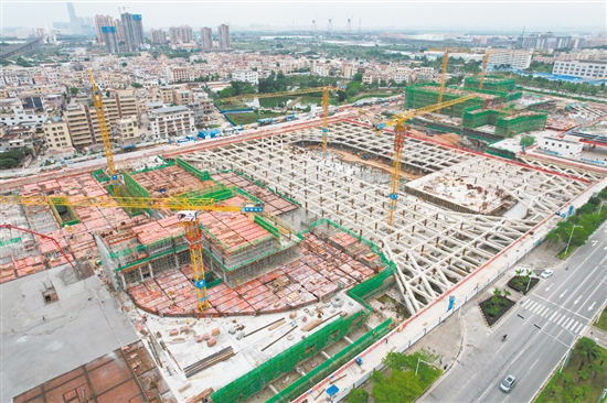 在江门市中心医院新院区建设现场,只见4幢大楼拔地而起,7台塔吊来回转运大型建材,工人们正散布在各个作业区内,忙忙碌碌地赶工期。“目前,已完成结构施工约30%,每天有900余人施工。”施工方相关负责人黄振洋说,项目规划床位1500张,预计于2023年底完成主体结构封顶。
