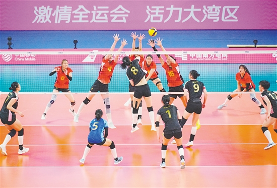 江门深化“体育+旅游”“演艺+旅游”融合。图为在江门举行的十五运会排球(女子20岁以下组)赛现场。郭永乐 摄